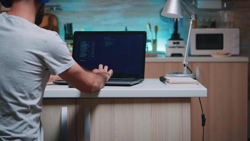 Male hacker typing on keyboard a dangerous malware to steal from government server wearing headset, working from home. Programmer writing a dangerous malware for cyber attacks during midnight. Pro Video