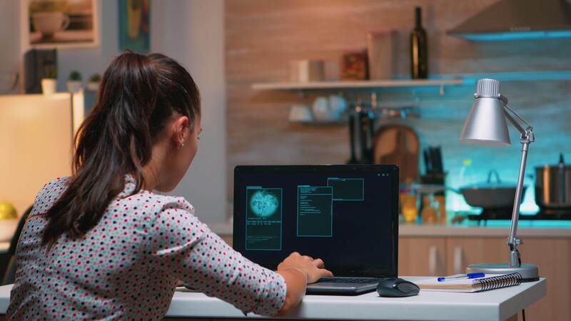 Hacker woman finishing succesfully hacking company system stealing database company. Programmer writing a dangerous malware for cyber attacks using performance laptop during midnight. Pro Video