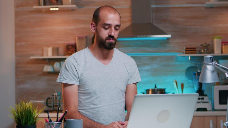 Man discussing on call working from home sitting in kitchen looking on laptop. Busy focused employee using modern technology network wireless doing overtime for job reading writing, searching Pro Video