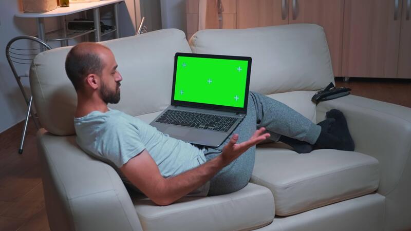 Tired man sitting on sofa while browsing marketing information using laptop computer with mock up green screen chroma key display. Caucasian male using modern technology wireless late at night Pro Video