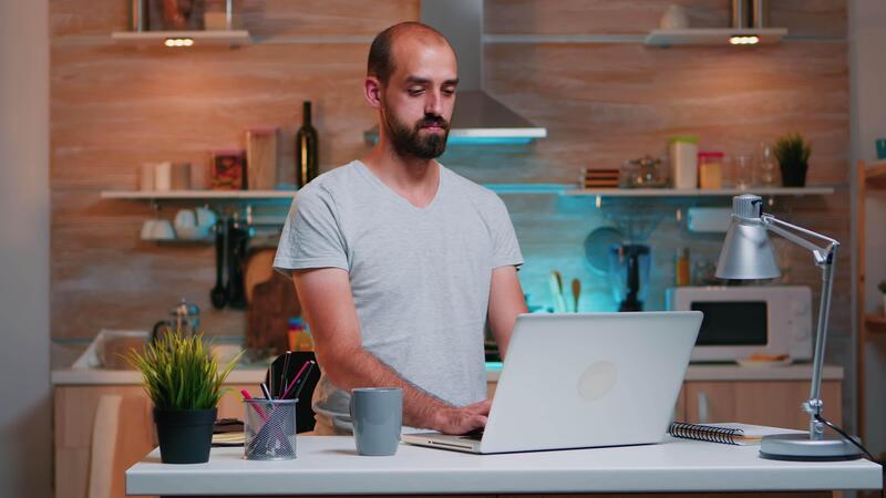 Man thinking at next project while working from home reading the tasks looking on laptop sitting in home kitchen. Busy employee using modern technology network wireless doing overtime reading writing, searching Pro Video