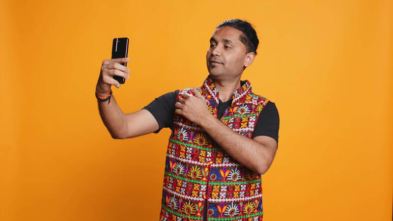 Indian narcissistic man using cellphone to take selfies from all angles. Vain social media user taking photos using phone selfie camera, smiling happily, studio background, camera B Pro Video
