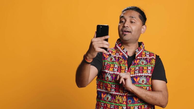 Happy man chatting with friend over online videocall on smartphone, doing friendly gestures. Smiling person communicating with mate on teleconference using mobile phone, studio background, camera A Pro Video
