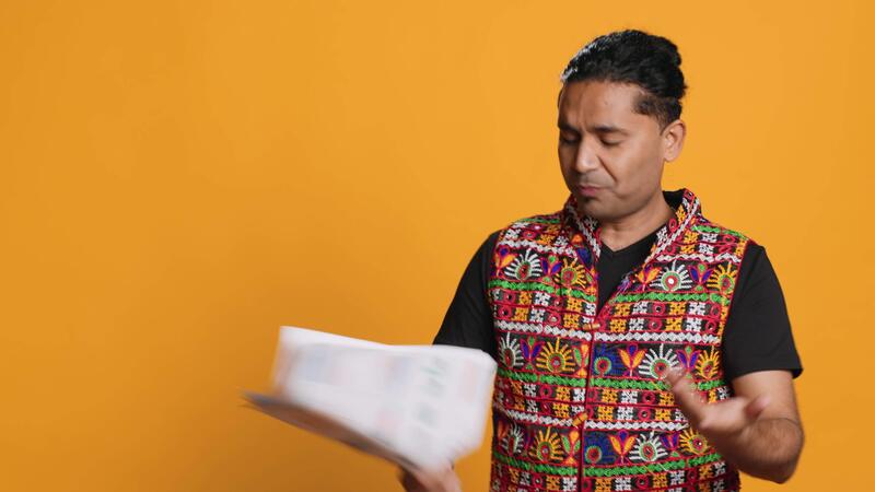 Indian man browsing though financial audit report files, throwing them in anger, feeling overworked, studio background. Stressed worker annoyed by paperwork, refusing to work anymore, camera A Pro Video