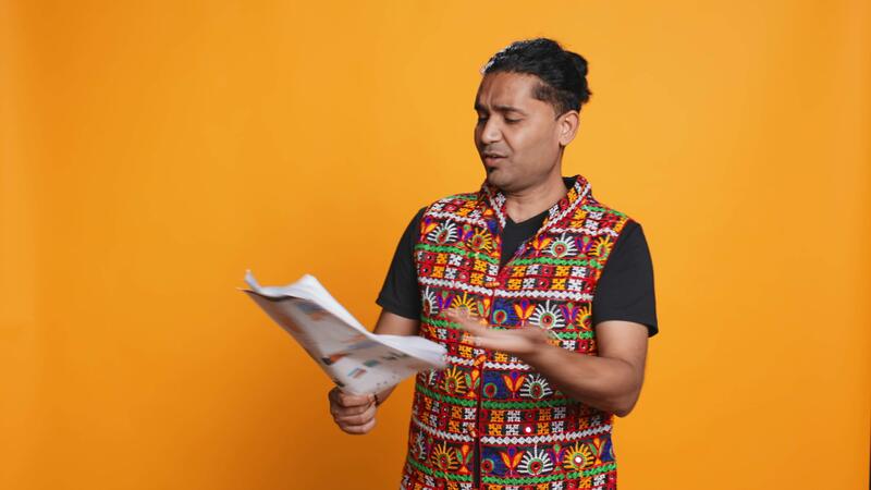 Indian man browsing though financial audit report files, throwing them in anger, feeling overworked, studio background. Stressed worker annoyed by paperwork, refusing to work anymore, camera B Pro Video