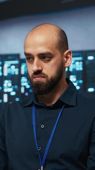 Vertical Computer scientist programming in data center room housing blade servers storing datasets. IT professional writing code on PC to mend data storage facility racks doing complex computational operations Pro Video