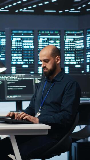 Vertical Experienced person typing code on computer monitors in high tech facility with server rows providing computing resources. IT professional overseeing rackmounts operating data Pro Video