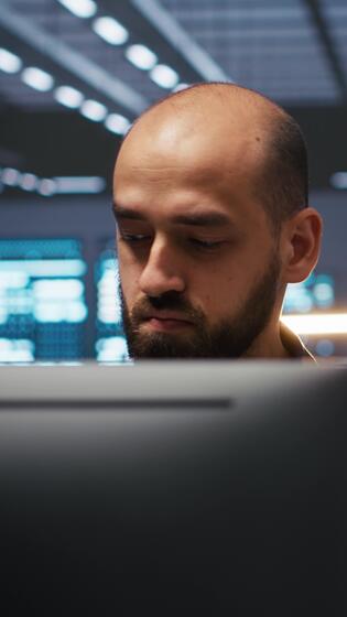 Vertical Man in server room typing code, ensuring data remains shielded from threats. Panning shot of IT technician protecting supercomputers against unauthorized access, securing system from hackers Pro Video