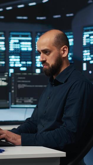 Vertical System administrator programming in server farm housing advanced equipment storing massive datasets. Programmer running code on PC to mend data center racks doing complex computational operations Pro Video