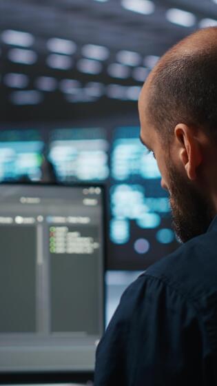 Vertical System administrator running script on computer screen in high tech data center, ensuring optimal performance. Worker monitoring energy consumption, doing checkup on server rackmounts clusters Pro Video