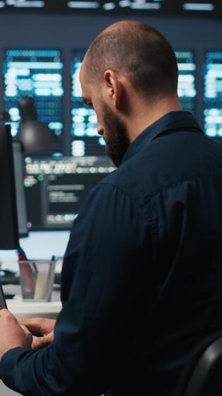 Vertical Computer scientist using laptop device to do programming in data center room housing servers . IT supervisor writing code on notebook to mend data storage facility racks doing computational operations Pro Video