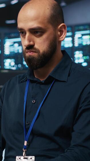 Vertical System administrator in server hub coding, ensuring data remains shielded from threats. IT developer safeguarding supercomputers against unauthorized access, securing system from hackers Pro Video