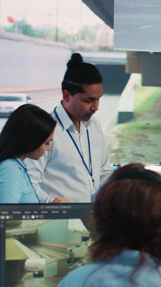 Vertical Indian supervisors examining traffic routes on satellite map, gathering data on surveillance CCTV system to ensure express delivery. Employees tracing and locating trucks with gps network. Camera B. Pro Video