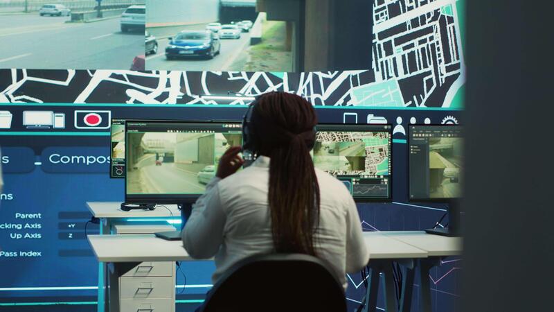 Diverse call center operators monitoring couriers in traffic and update clients on potential order delay due to busy routes. Employees guiding the delivery cars via gps and satellite map. Camera A. Pro Video