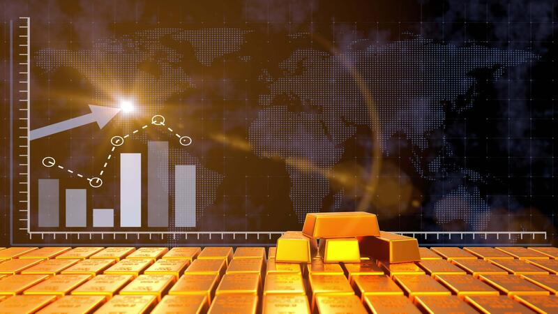 Animation of slowly moving gold bars against the background of charts and columns of the financial market. 3D render. Pro Video