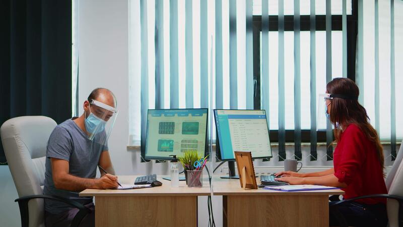People with mask and visor working in new normal office checking reports and writing on computer. Coworkers in modern workplace respecting protection rules against covid virus using plexiglass. Pro Video