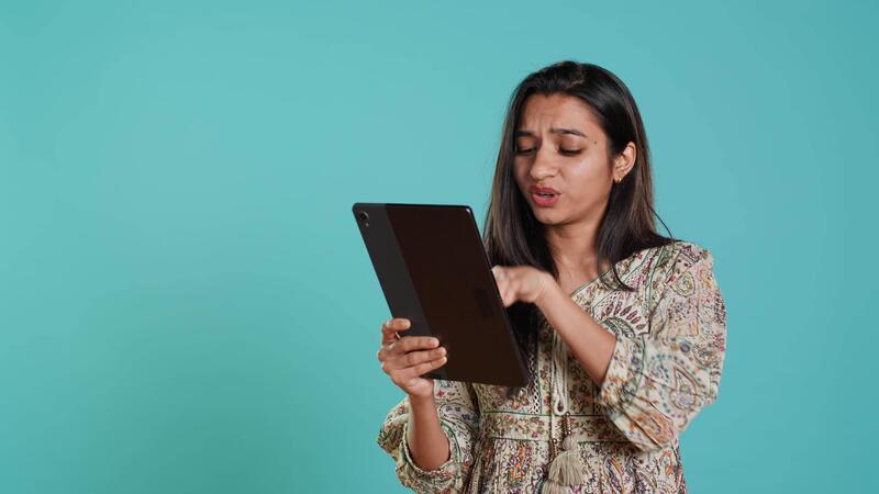 Woman trying to do purchases, frustrated with error received while adding payment method on website, studio background. Upset person unable to do internet shopping, getting card rejected, camera A Pro Video