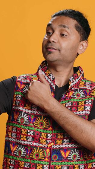 Vertical Indian narcissistic man using cellphone to take selfies from all angles. Vain social media user taking photos using phone selfie camera, smiling happily, studio background, camera A Pro Video