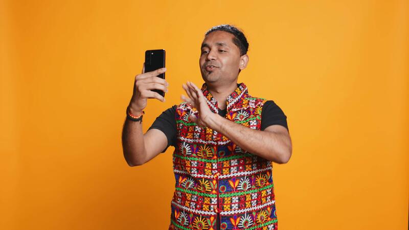 Happy man chatting with friend over online videocall on smartphone, doing friendly gestures. Smiling person communicating with mate on teleconference using mobile phone, studio background, camera B Pro Video