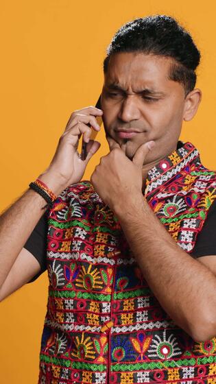 Vertical Indian man discussing with best friend over telephone call using smartphone. Cheerful person talking with mate in phone call using cellphone, isolated over studio background, camera A Pro Video