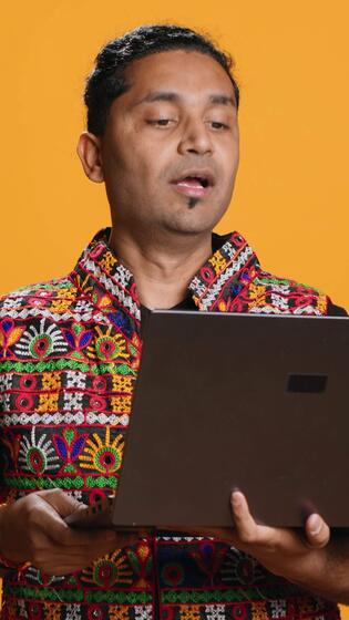 Vertical Indian man having entertaining conversation with friends during teleconference meeting using laptop, studio background. Happy person interacts with mates during online videocall on notebook, camera A Pro Video