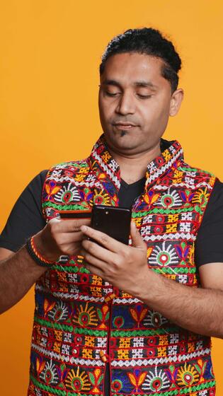 Vertical Indian man adding payment method on mobile phone website, purchasing stuff, isolated over studio background. Client does internet shopping, typing debit card info on cellphone, camera B Pro Video