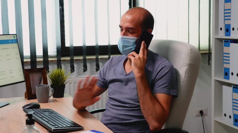 Manager wearing mask explaining on phone problem solution sitting on desk in office room. Freelancer working in new normal workplace speaking on smartphone with remotely colleagues in front of pc Pro Video