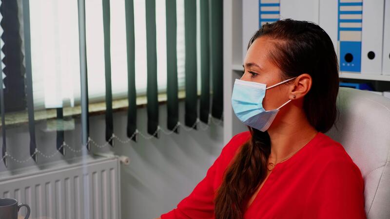 Portrait of woman with protection mask looking and working on computer. Employee in new normal office workspace typing on computer keyboard looking at desktop respecting social distancing Pro Video