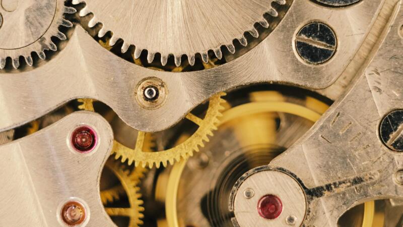 Clock mechanism close-up. Gears and cogs in clockwork watch mechanism Pro Video