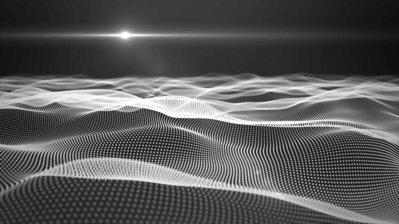 Monochrome 3D background with flying over abstract field of smoothly moving white particle waves with bright light on a black background and soft glow effect , motion graphics , 4k , 60 fps Pro Video