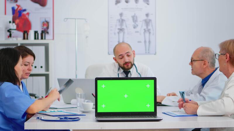 Team of physicians having medical brainstorming sitting on desk in hospital meeting room placing laptop with green screen in front of camera. Using computer with mock up display green chroma key. Pro Video