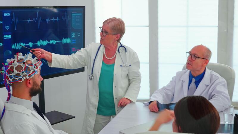 Scientist doing brain analysis using headset with sensors on doctor in hospital meeting room. Monitor shows modern brain study while team of scientist adjusts the device working in conference office Pro Video