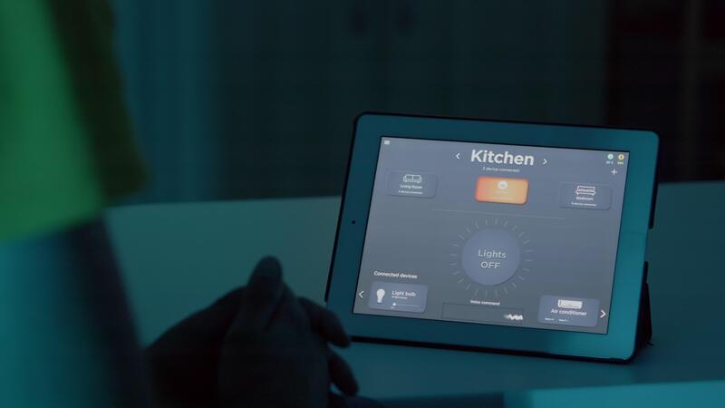 Man sitting at desk in smart home automation system talking to voice assistant on tablet to turn on lights of house. Male using intelligent software, gadget placed on kitchen table controlling light Pro Video