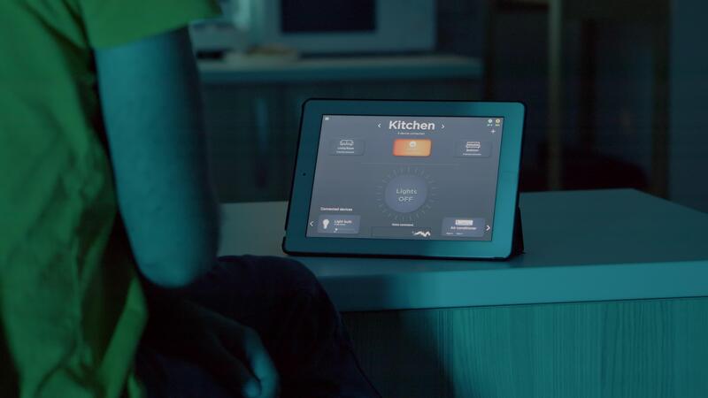 Young man using smart home application with voice command to turn on the light with digital tablet. Male using lighting control app software in modern house with automation system Pro Video