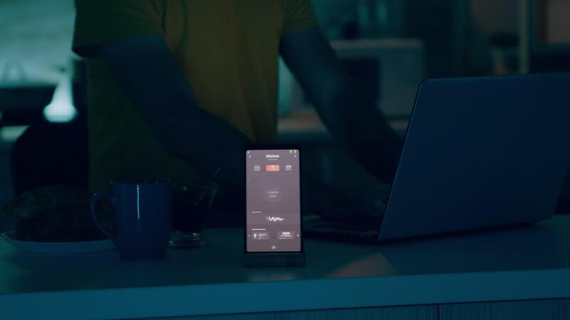 Man working from home with automation lighting system using voice controlled on smartphone turning on the light. Smart speaker gadget responds to commands, person controlling electricity effiency Pro Video