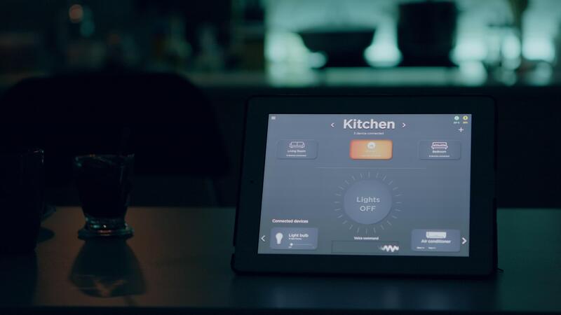 Close up of tablet with wireless lighting automation software placed on kitchen desk in empty house with smart system, turning on lights. Notepad with high tech app controlling electricity effiency Pro Video