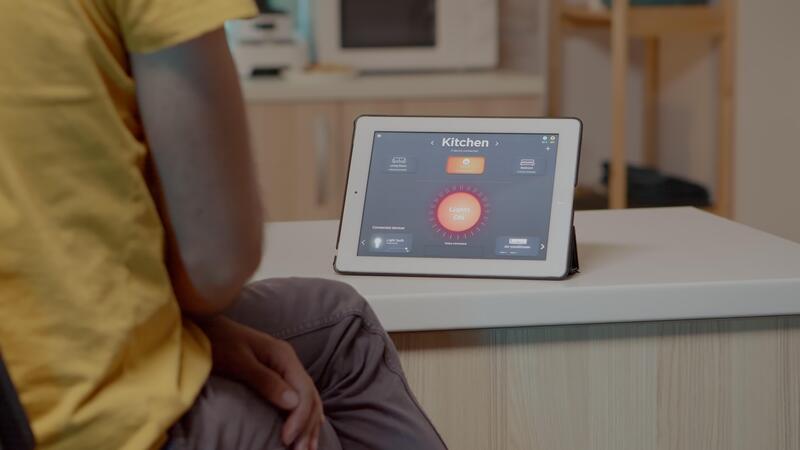 Man looking at tablet in house with automation lighting system, sitting in kitchen switching on bulbs using voice command. Person controlling lights using wifi gadget with smart home application Pro Video