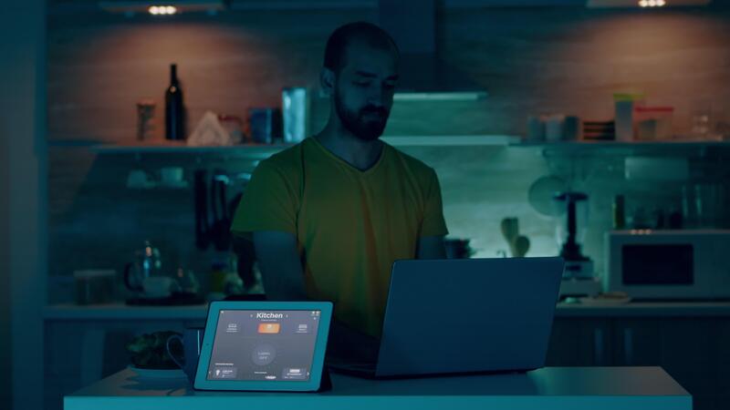 Man working from house with automation lighting system, controlling ambience with wifi gadget, sitting in kitchen turning on the lights. Person using voice command to smart home application on tablet. Pro Video