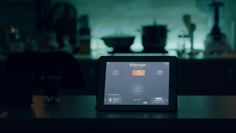 Tablet with intelligent software placed on table in kitchen with nobody in, controlling light with high tech application. Notepad with smart home app in empty house automation system Pro Video