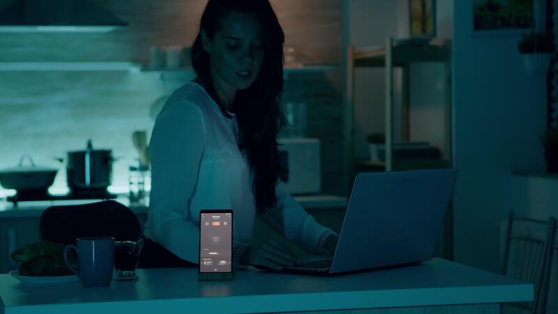 Freelancer working from house with automation lighting system sitting in kitchen turning on lights using voice command to smart home application on smartphone. Person monitoring light with wifi gadget Pro Video