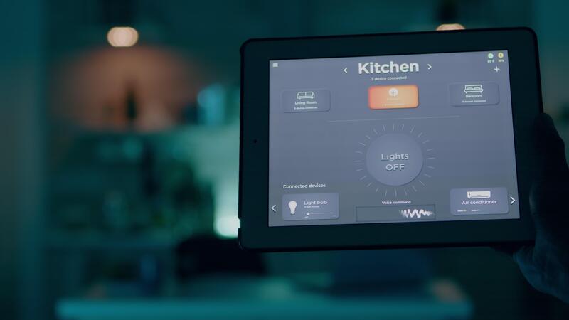 Man holding tablet with lighting control application, turning on the lights sitting in kitchen house with automation lighting system. Person using high technology software working remote at laptop Pro Video
