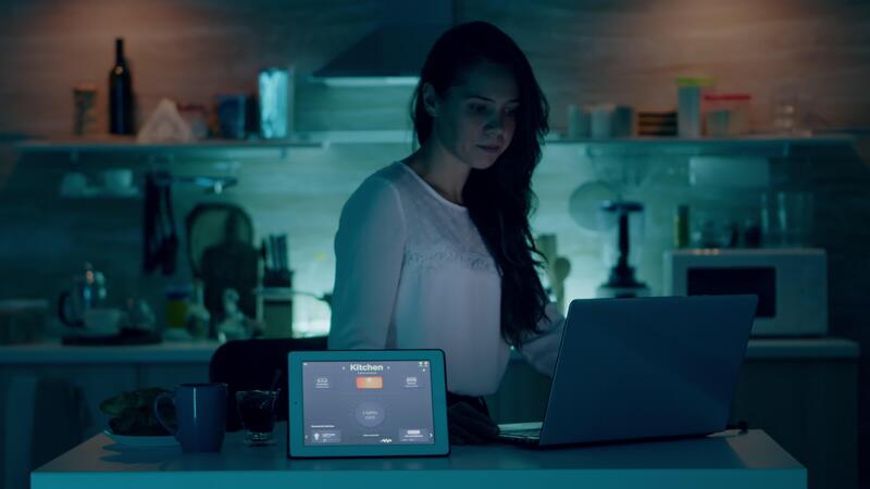 Woman using voice activated smart wireless lighting app on tablet turning on the bulbs in house with modern software working at laptop. Person controlling ambience light with future technology Pro Video