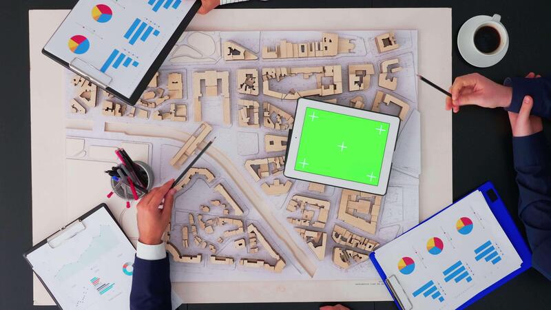 Top view of close up architecture businesspeople working in boardroom meeting, discussing architectural plans for new sustainable shared office looking on greenscreen tablet. Notebook with chroma key Pro Video