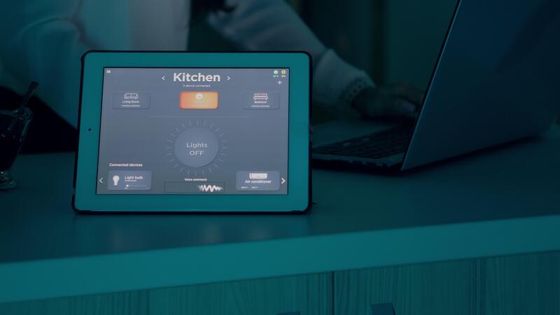 Female typing on laptop working from home with automation lighting system using voice controlled on tablet switching on bulbs. Smart gadget responds to commands, woman using automated app software Pro Video