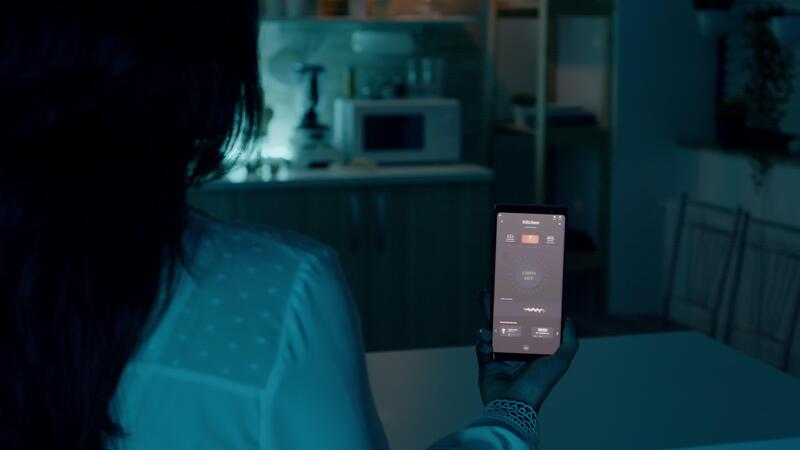 Person looking at mobile phone with lighting controlling app sitting in kitchen of house with automation light system, turning on bulb using voice command. Woman monitoring electricity effiency Pro Video