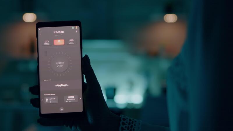 Woman holding smartphone with voice activation smart light app to turn on the lights in house. Person using future technology and smart software switching on bulbs wireless before working at laptop Pro Video