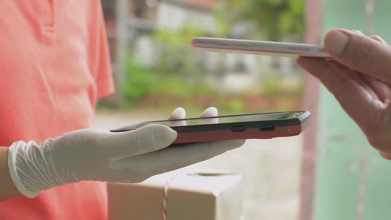 Close up of a man receiving a box from a delivery woman and using QR code scan with smartphone for payment. Free Video