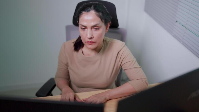 Asian woman working on desktop computer in startup office Experts are coding software for Big Data Blockchain projects. Free Video