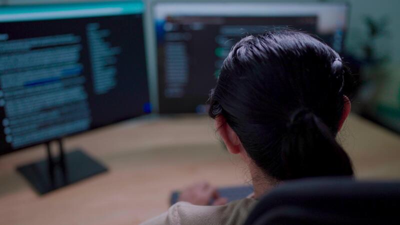 Close-up of IT woman working on desktop computer in data center control room Young professionals writing about programming code languages Free Video