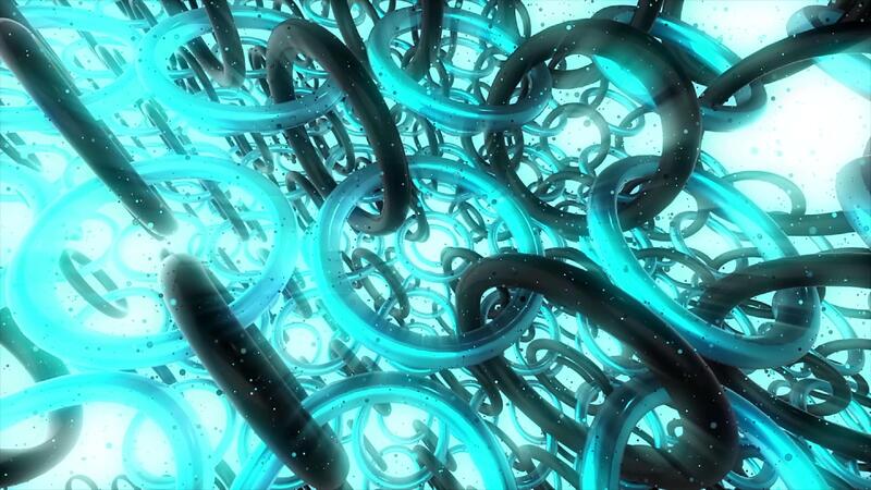 Animation of chains of rotating rings. Motion. Lot of chains with rotating rings and emitting colored light. Space with infinite rings rotating in chains Pro Video